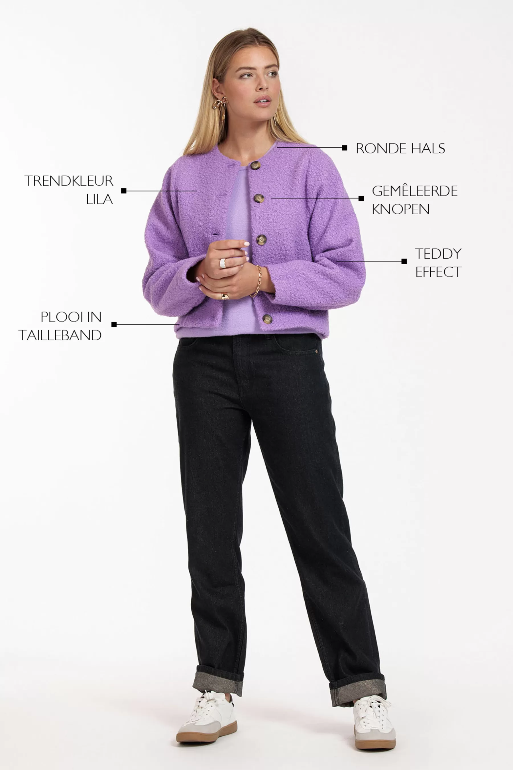 Dit lila jasje is ideaal voor het creëren van een warme en toch trendy look. De gemêleerde knopen voegen een subtiel detail toe, terwijl de plooien in de tailleband je figuur mooi accentueren zonder dat het jasje te strak zit. Door het teddy-effect voelt het materiaal niet alleen zacht aan, maar geeft het de jas ook een unieke en luxe uitstraling.