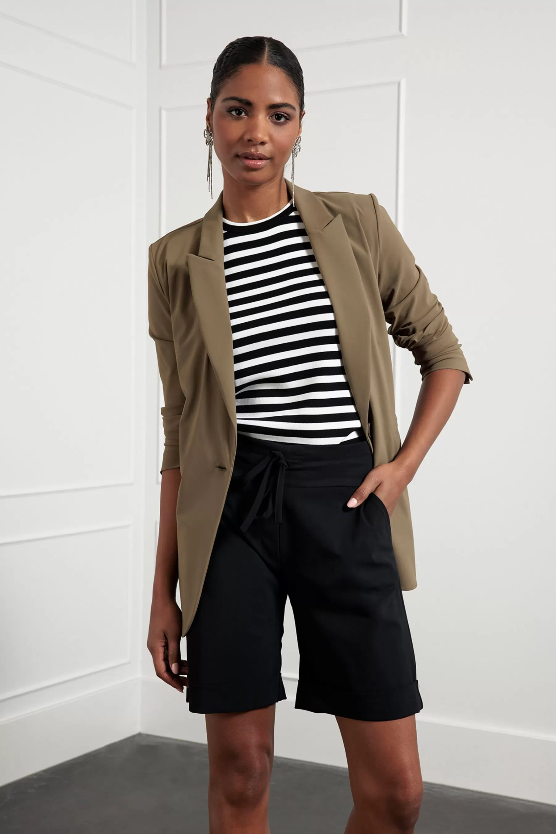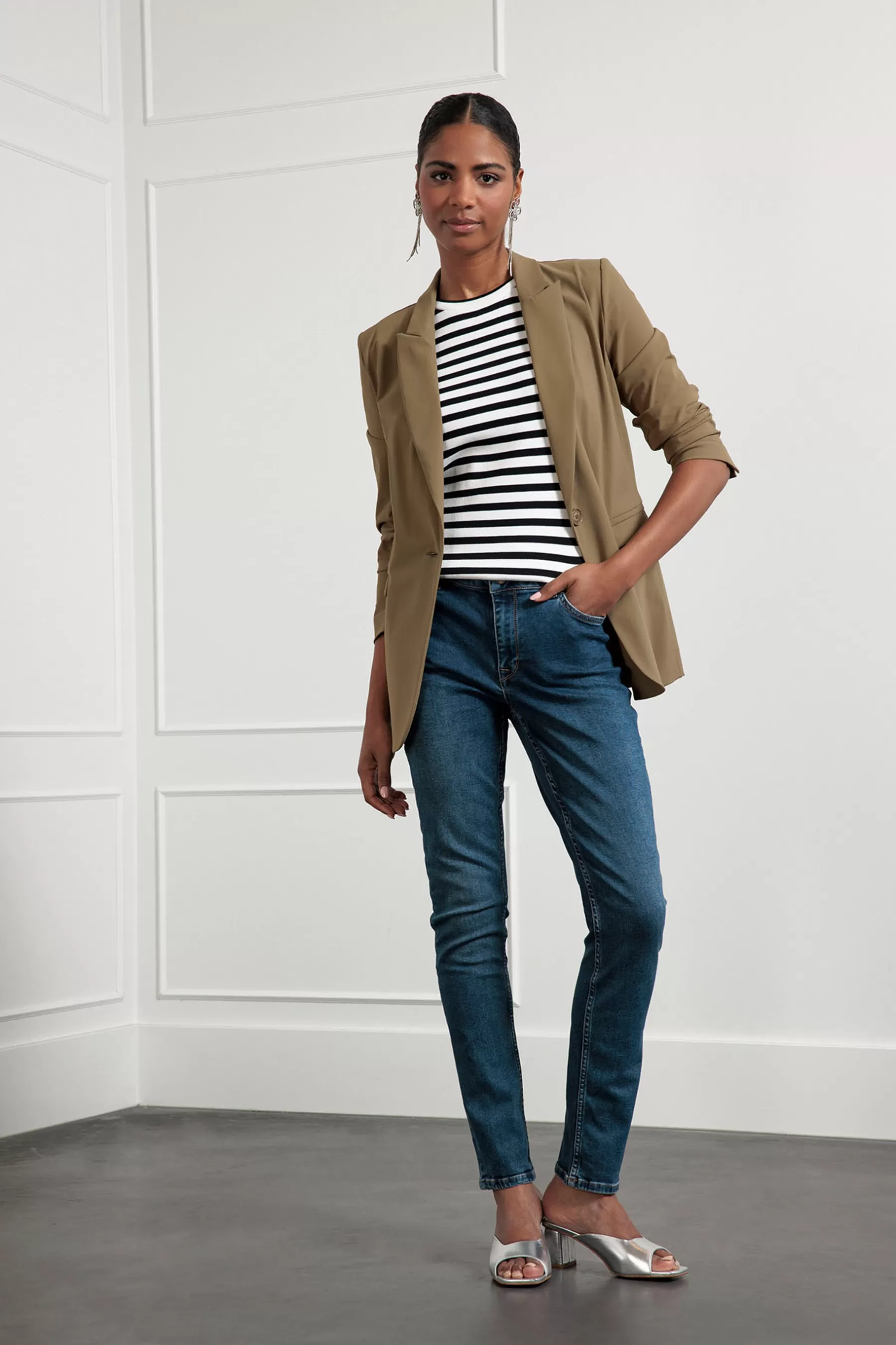 De Fran blazer van Studio Anneloes past helemaal in het modebeeld van nu, maar heeft ook een tijdloos karakter. Het is een boyfriend blazer met klepzakken die naar binnen gevouwen kunnen worden. Et voilà: je hebt paspelzakken. Verder heeft dit item schoudervullingen en ietwat wijde mouwen met knopen. Het is een wat langer model dat over de bil valt.