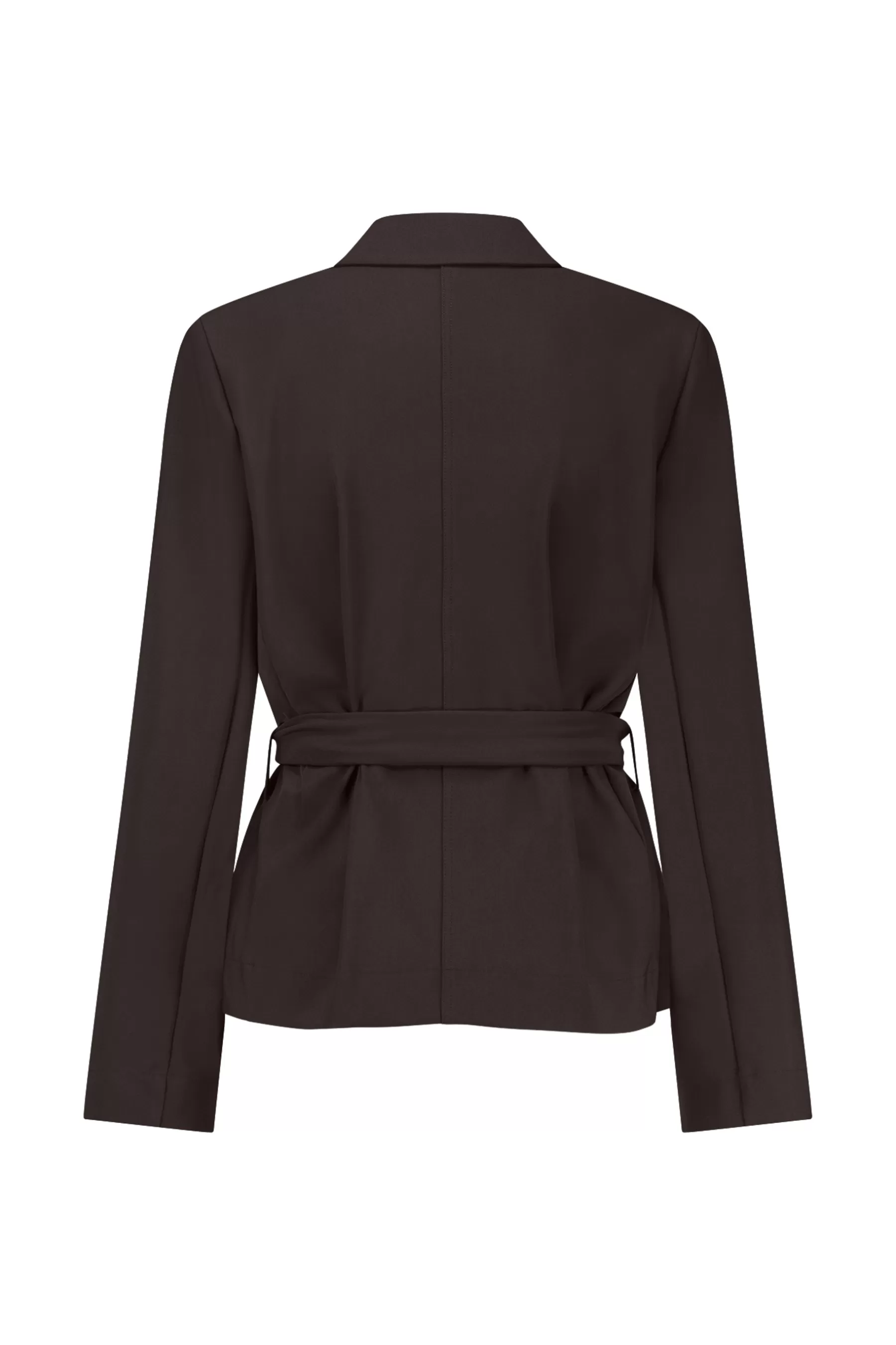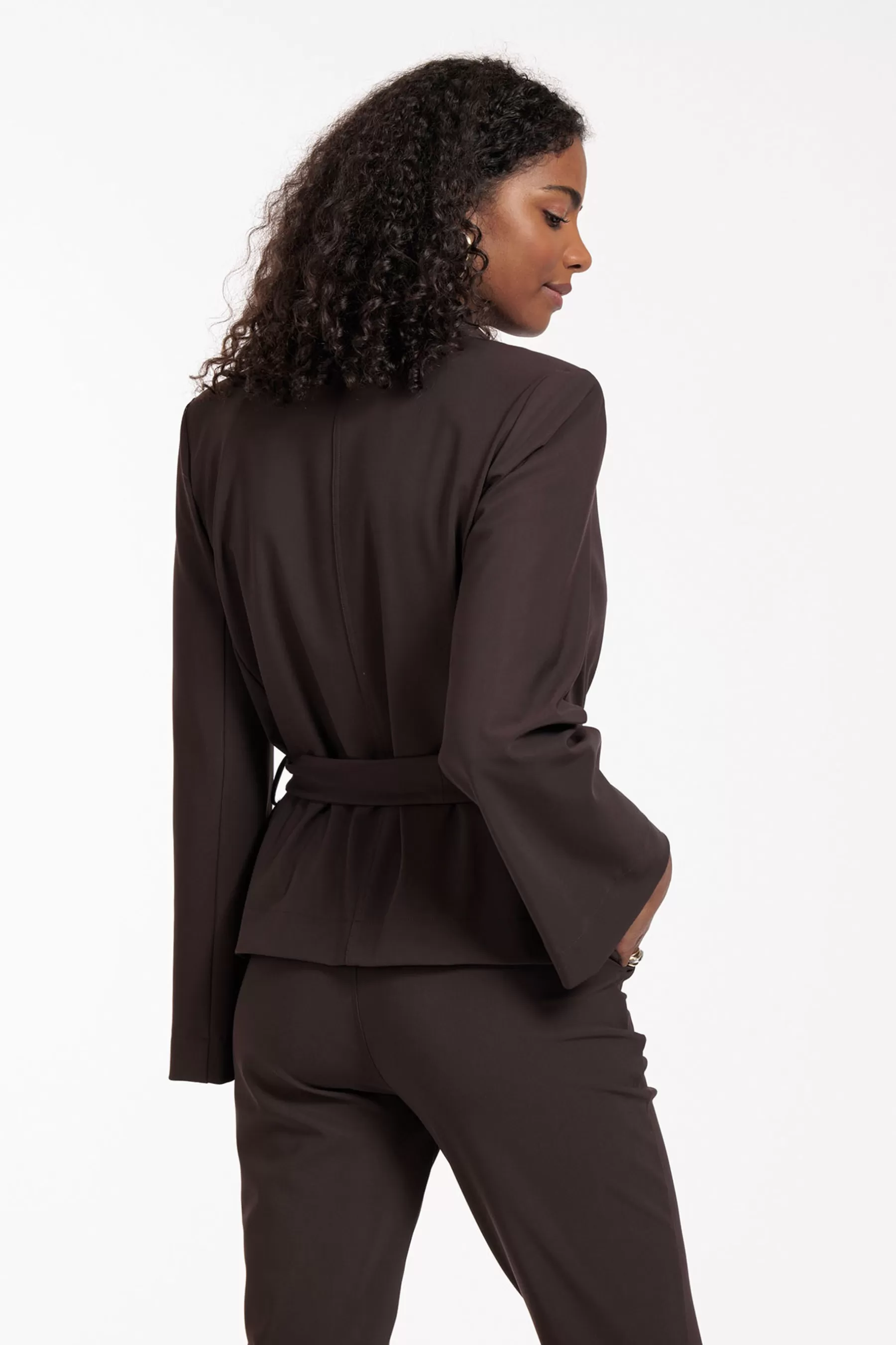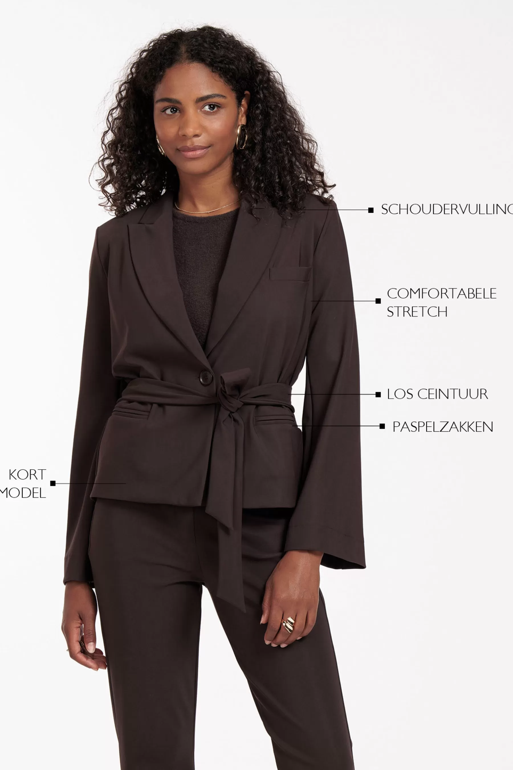 Deze Espresso-kleurige blazer sluit naadloos aan bij de aardse tinten van de Saddle Chic collectie. De Bonded Travelstof voelt stevig aan, biedt comfortabele stretch en is kreukvrij, wat de blazer geschikt maakt voor dagelijks gebruik en lange werkdagen. Het losse ceintuur benadrukt de taille op een elegante manier, terwijl de wijde mouwen en schoudervullingen een eigentijdse, modieuze look creëren. De blazer kan ook gedragen worden zonder ceintuur.