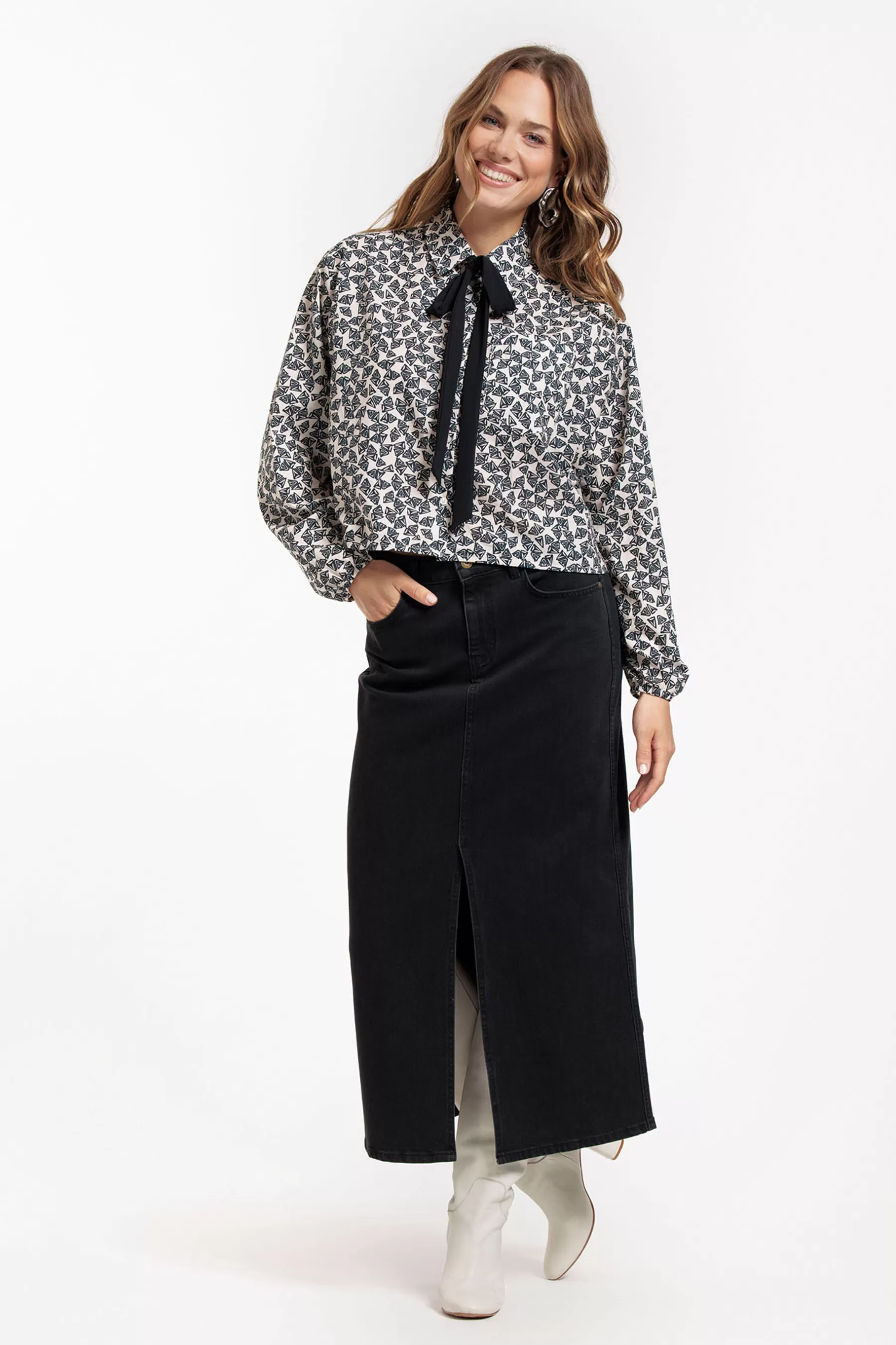 De speelse driehoeken-print en de bijpassende strik zorgen voor een extra dimensie aan je look, waardoor deze blouse ideaal is voor vrouwen die houden van een stijlvolle, maar toch speelse uitstraling. Combineer de blouse met een van de broeken uit de “BACK TO WORK” collectie voor een perfecte balans tussen chic en modern.