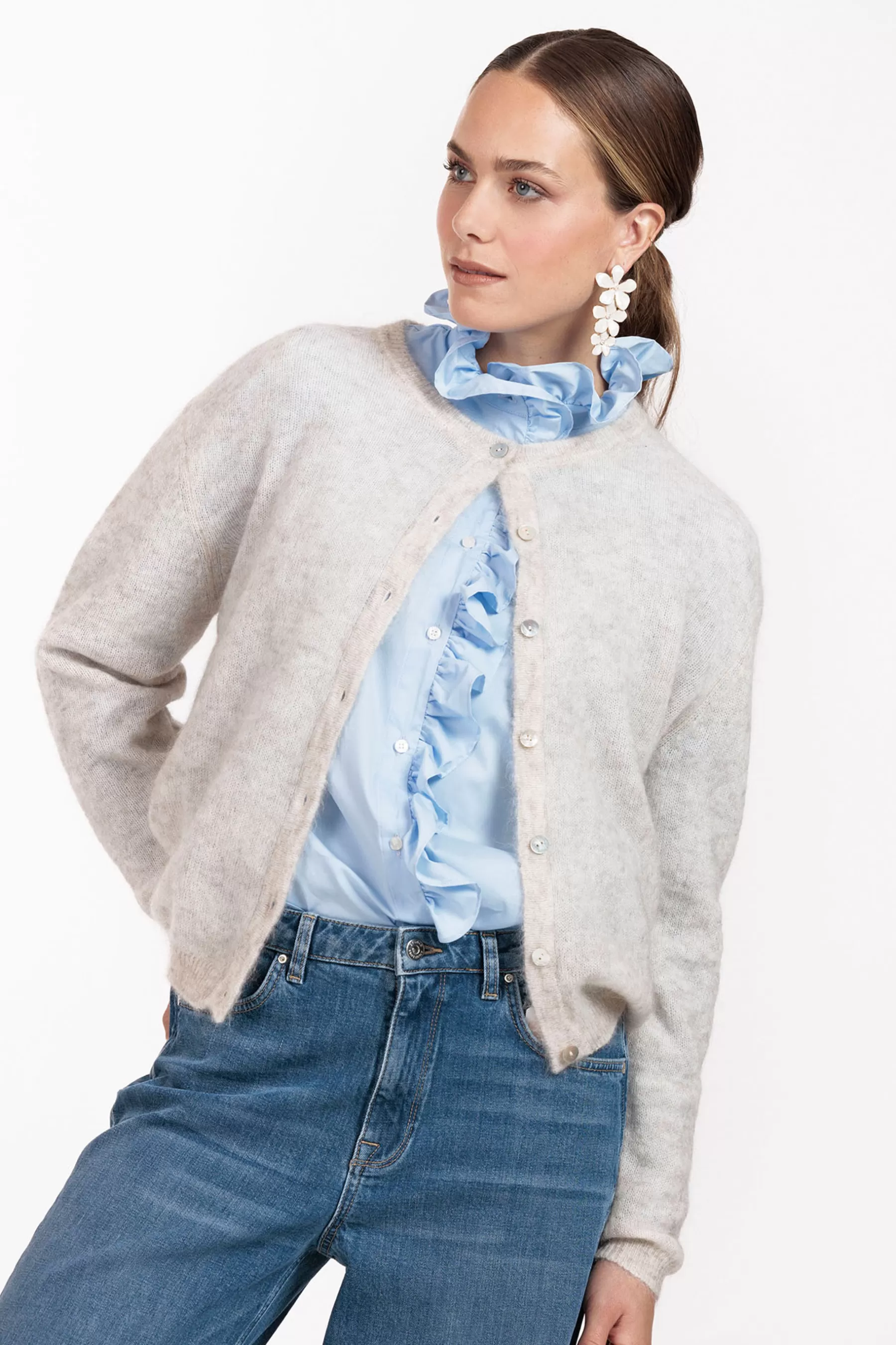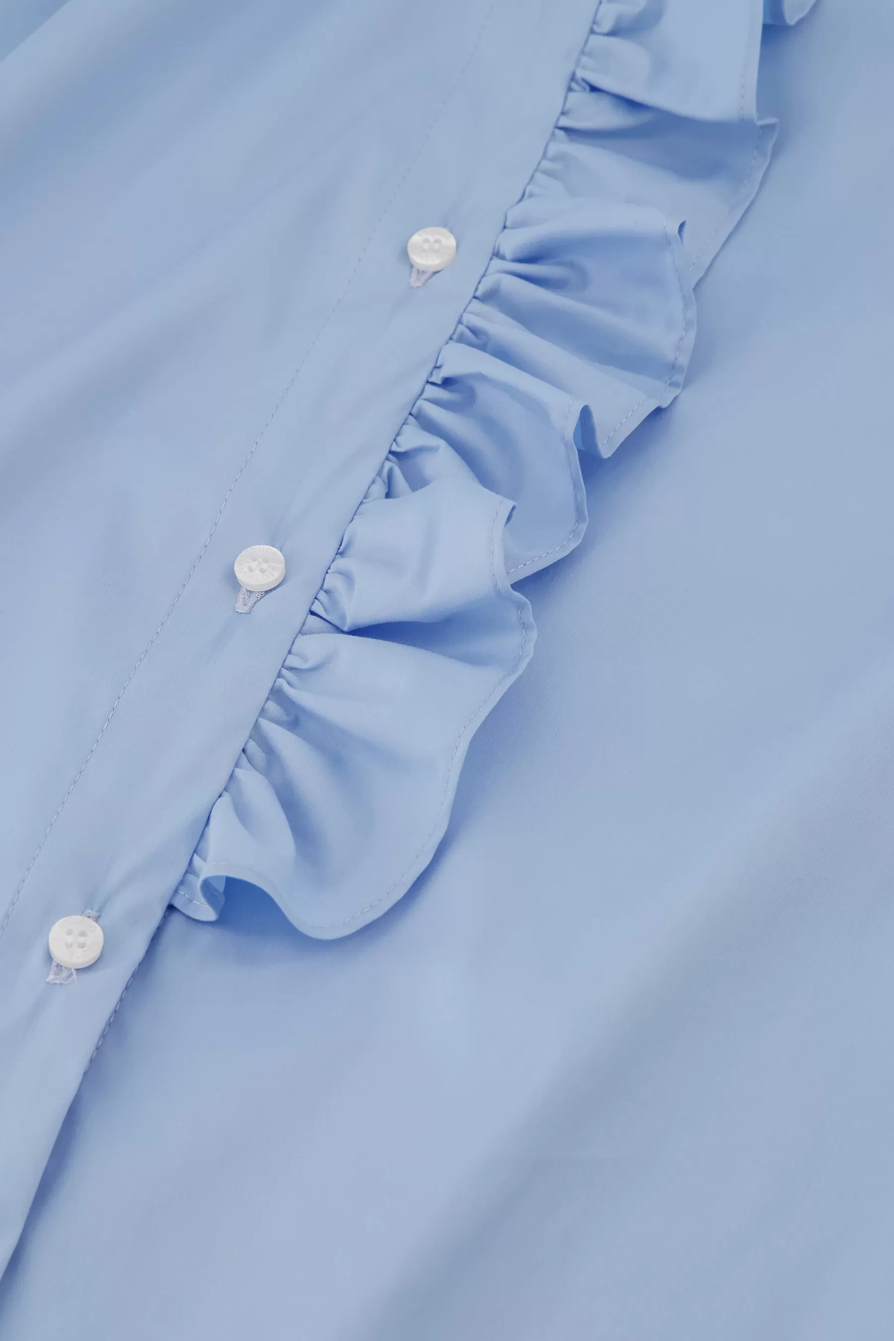 De hoge kraag en de ruffles op de knopenlijst geven de Idette poplin blouse een romantische uitstraling, terwijl de lange mouwen met manchetsluiting een klassieke touch toevoegen. De katoenblend zorgt voor een comfortabele pasvorm die de hele dag mooi blijft zitten.