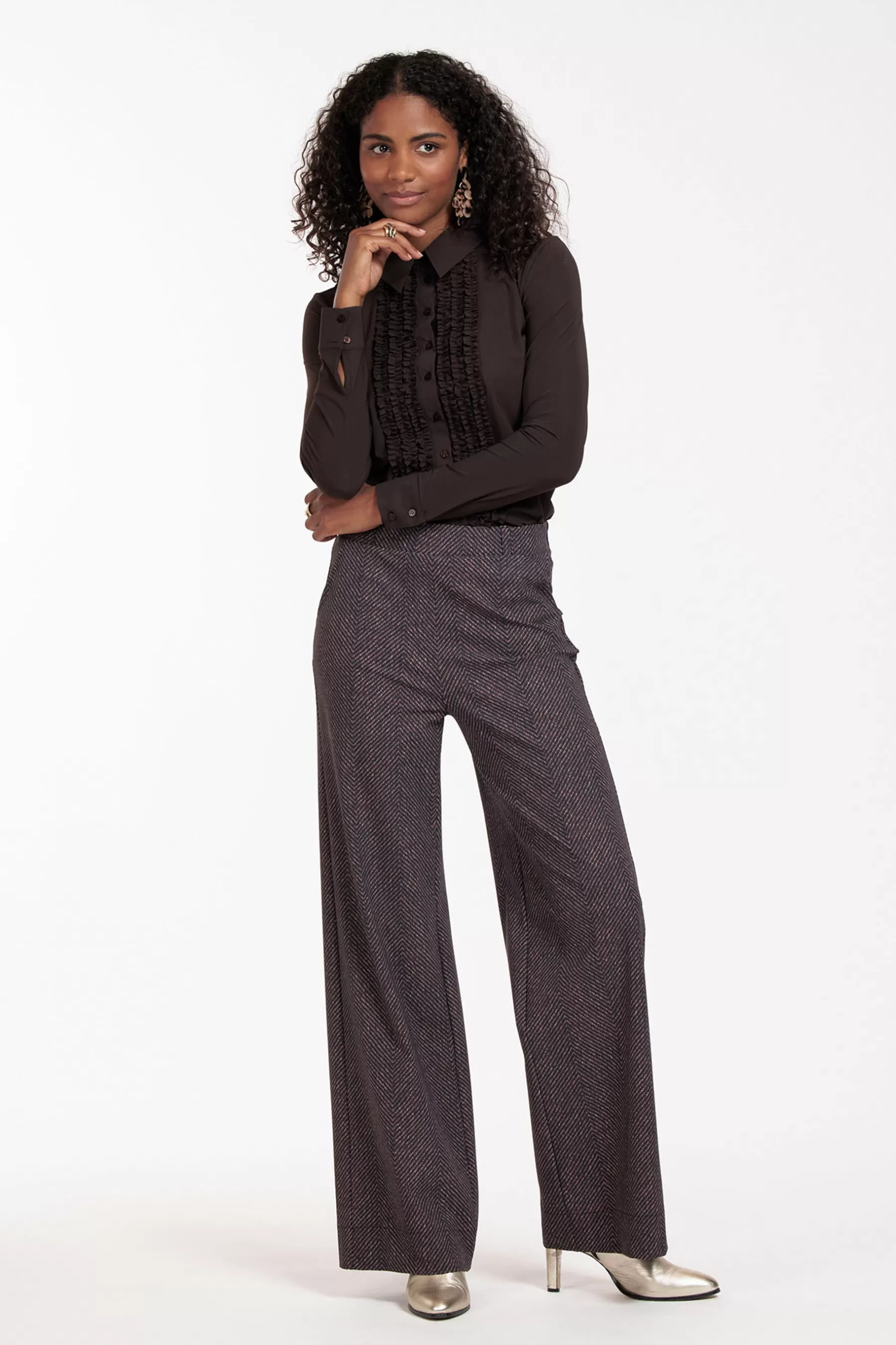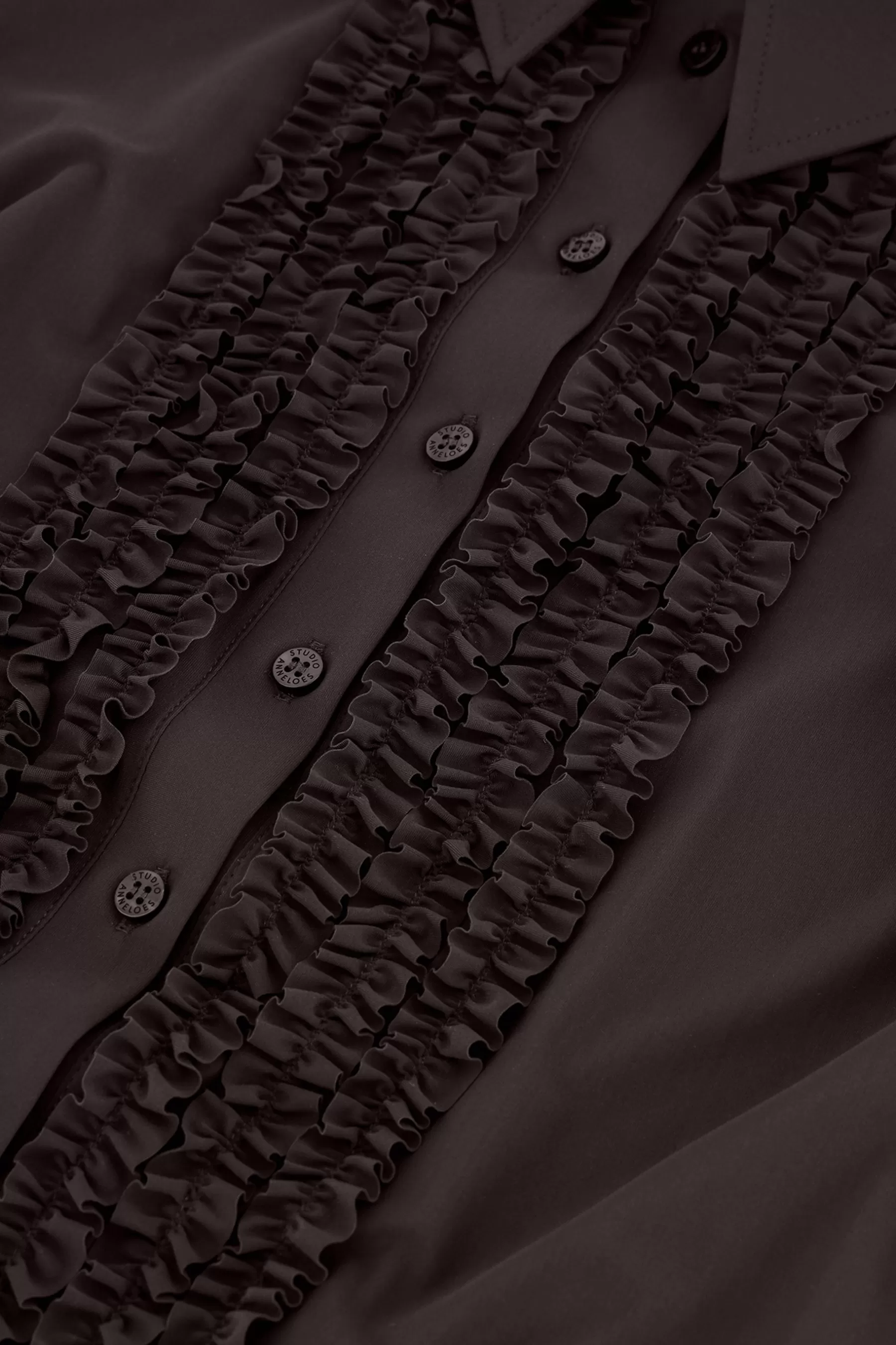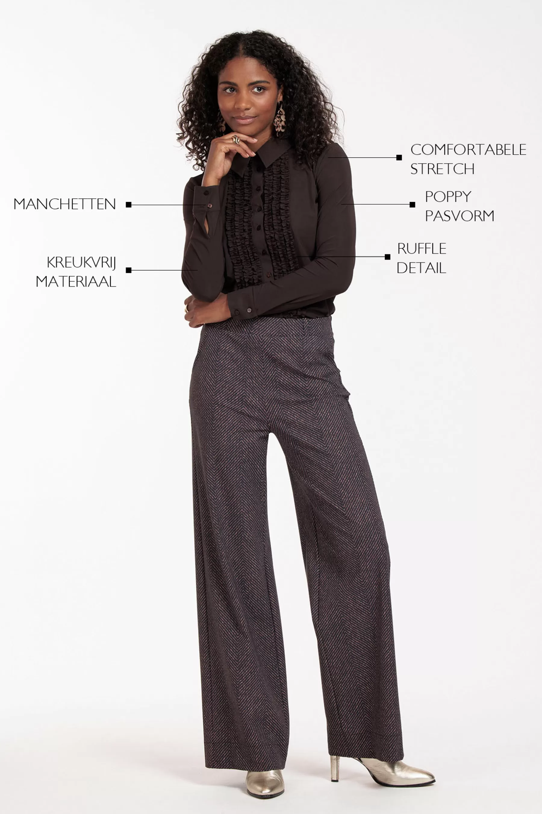 De Mallory ruffle blouse van Studio Anneloes in de kleur Espresso is een prachtige keuze voor wie op zoek is naar een vrouwelijke en elegante uitstraling. Met ruffles langs de knopenlijst voegt deze blouse een romantische touch toe aan je look. De blouse is gemaakt van comfortabele Light Travelstof, waardoor je de hele dag geniet van bewegingsvrijheid en een luxe gevoel.