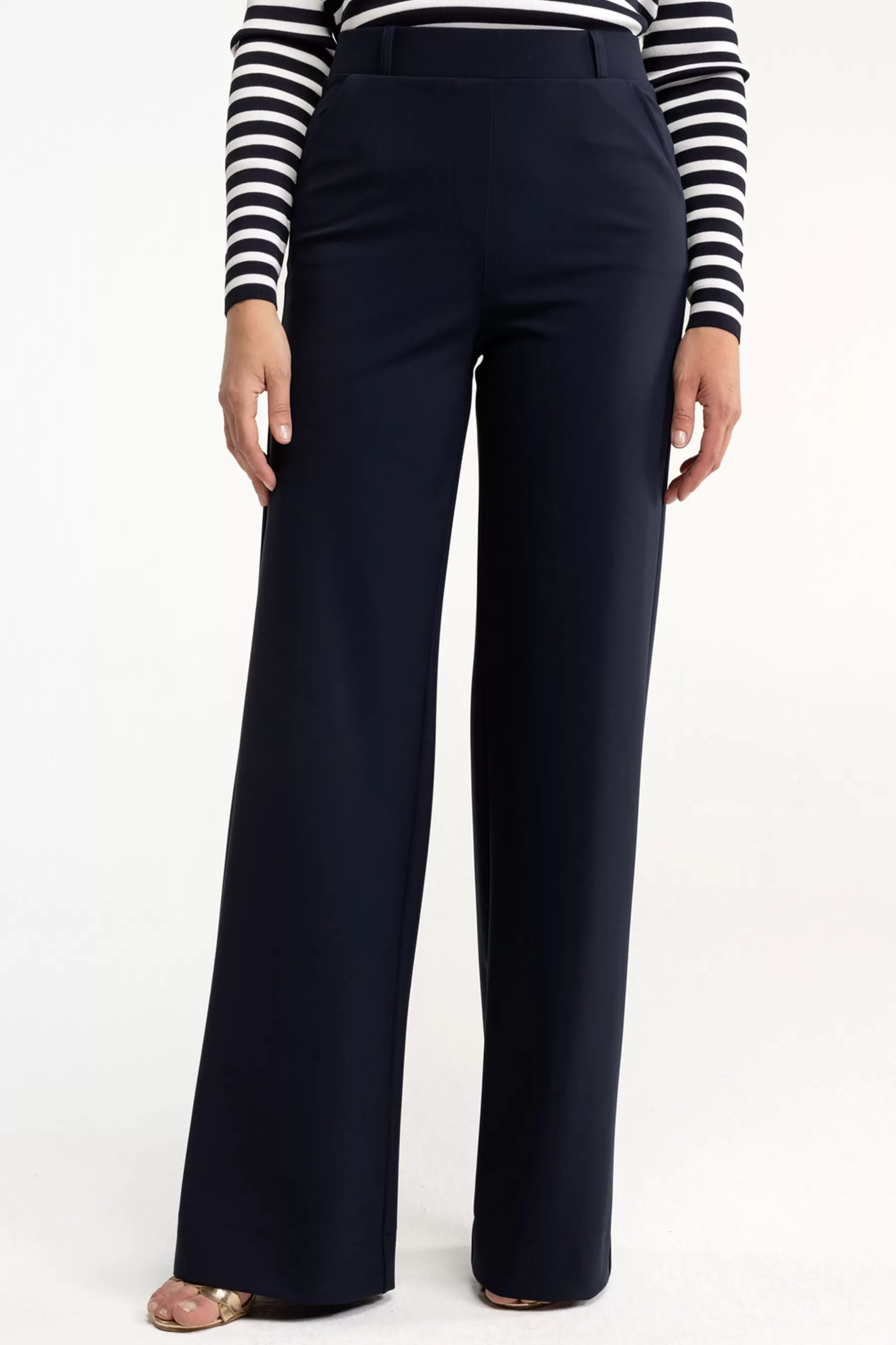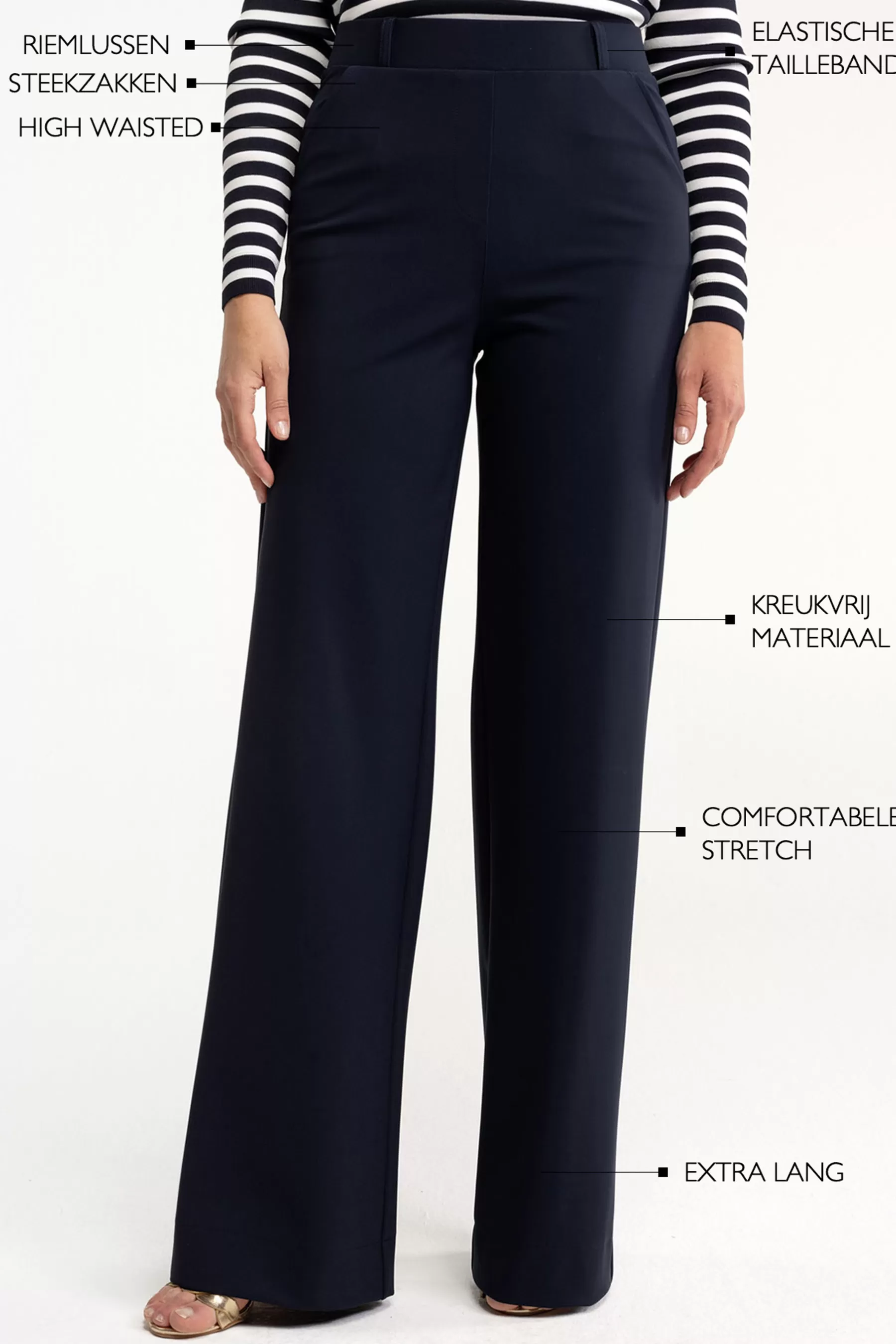 De Lexie LONG is een nieuwe toevoeging aan ons assortiment, met een perfecte pasvorm voor lange dames. De hoge taille en wijde pijpen creëren een elegant silhouet, terwijl de elastische tailleband voor comfort zorgt. De diepblauwe kleur maakt deze broek een veelzijdige keuze die makkelijk te combineren is.