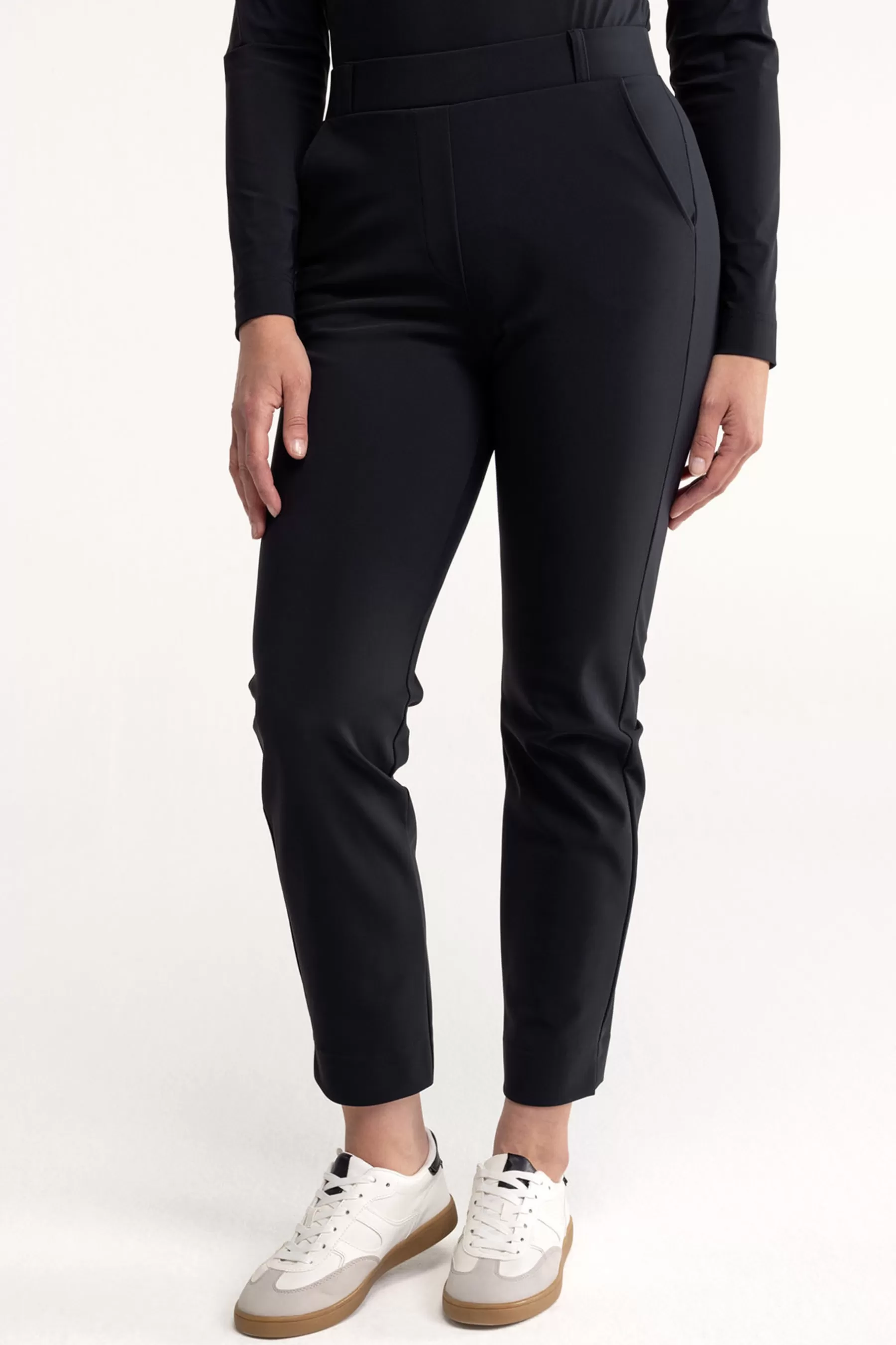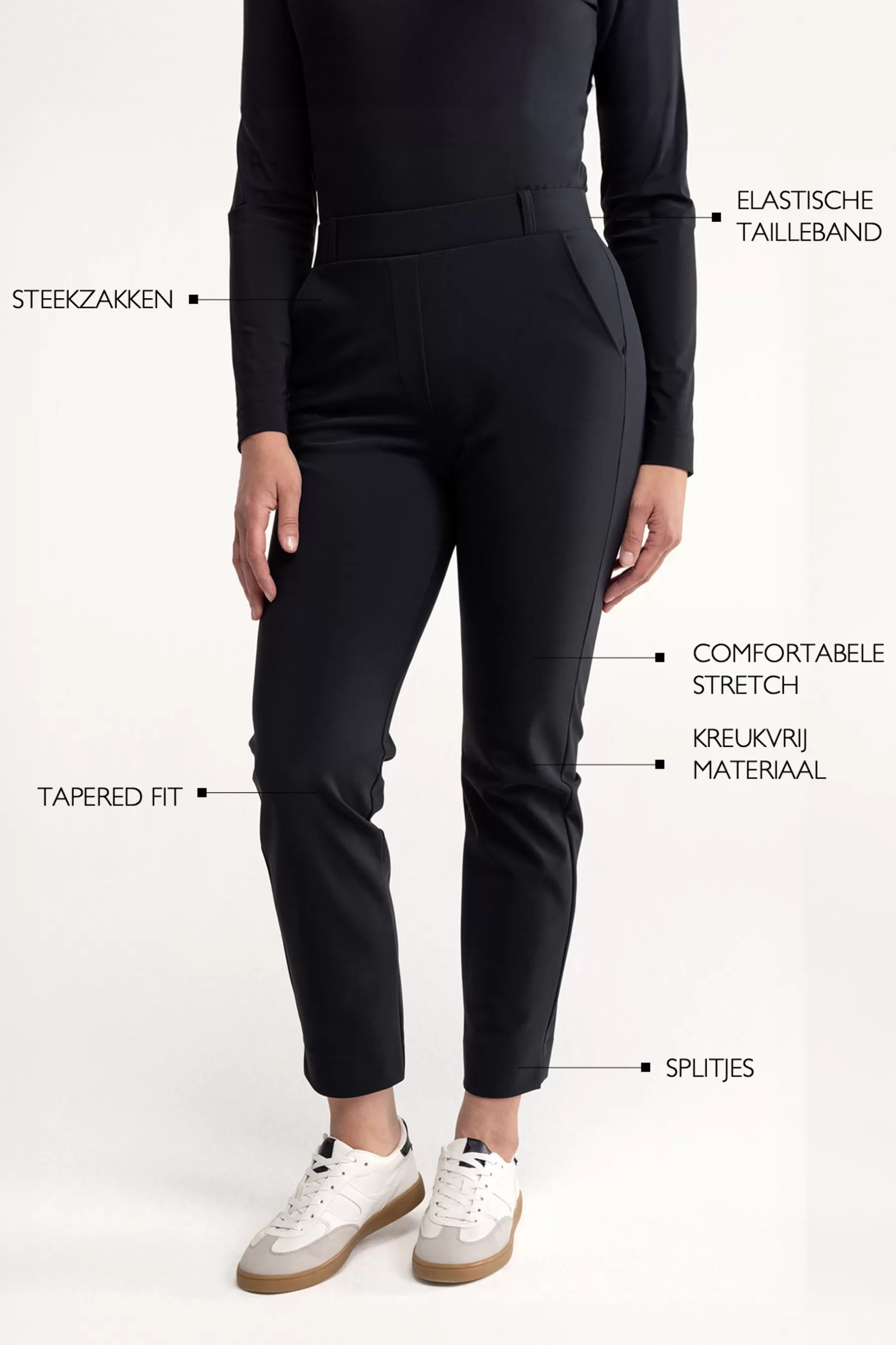 De zwarte Anne bonded trousers is ontworpen om je garderobe naar een hoger niveau te tillen. De stevige Bonded Travelstof biedt voldoende stretch en is kreukvrij, wat zorgt voor de perfecte combinatie van comfort en stijl. Bovendien droogt de stof snel en hoeft deze niet gestreken te worden, ideaal voor vrouwen met een drukke levensstijl.