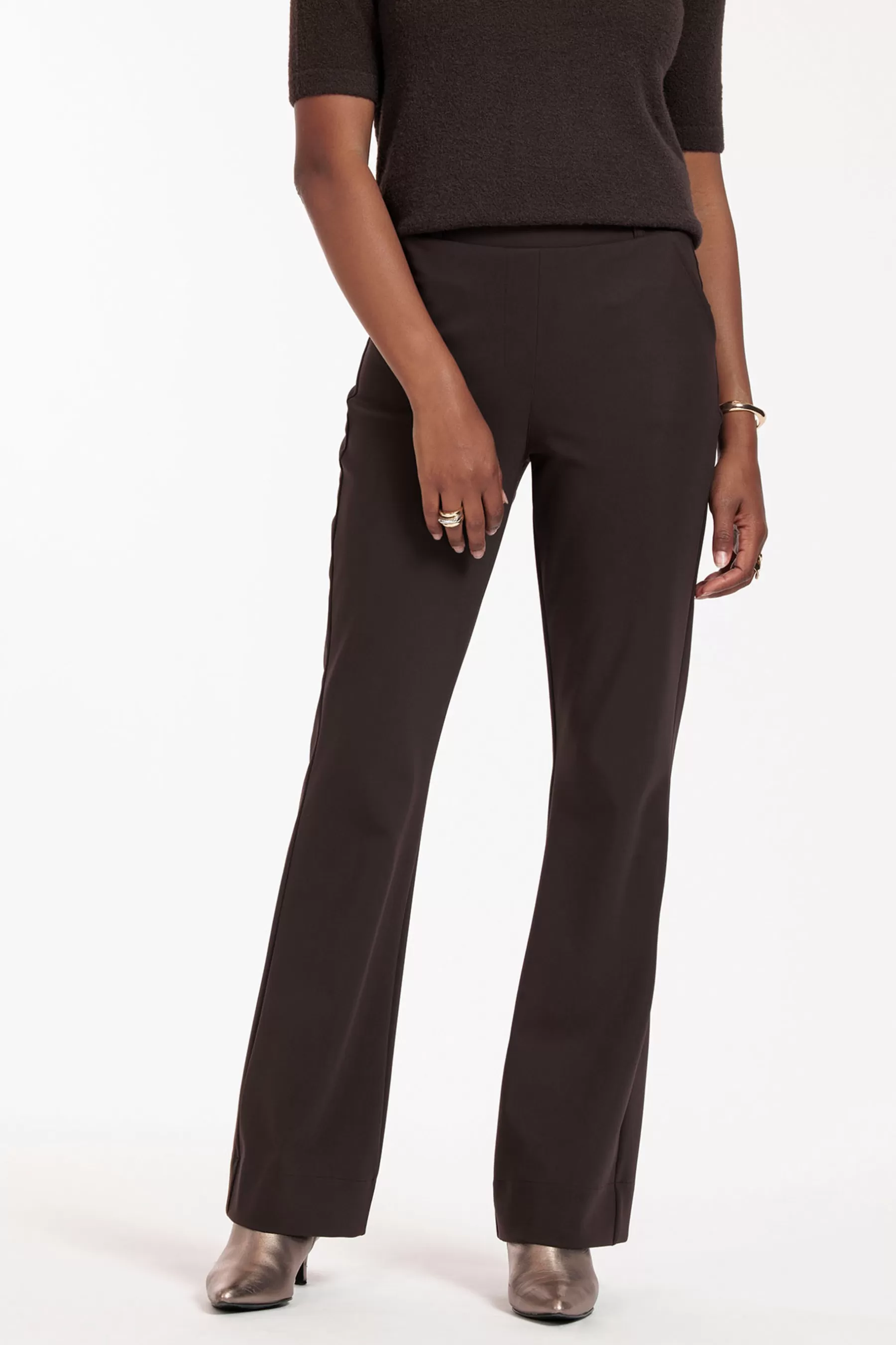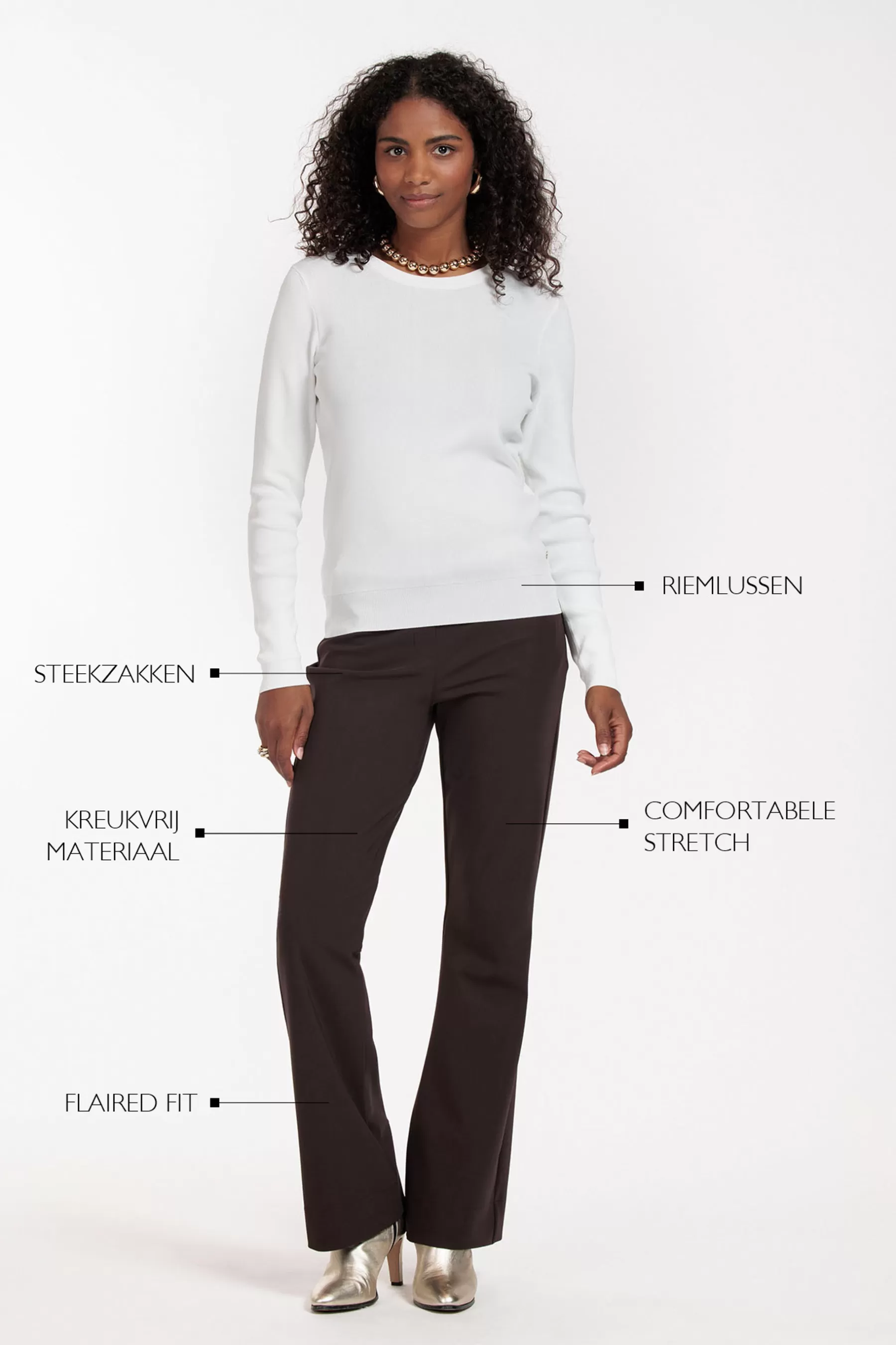 Deze Espresso-kleurige flared broek is een veelzijdig item binnen de Saddle Chic collectie. De Bonded Travelstof voelt stevig en zacht aan, en is ideaal voor lange dagen dankzij de kreukbestendigheid en stretch. De hoge taille en flared fit geven de broek een vrouwelijk en elegant silhouet dat de benen optisch verlengt.