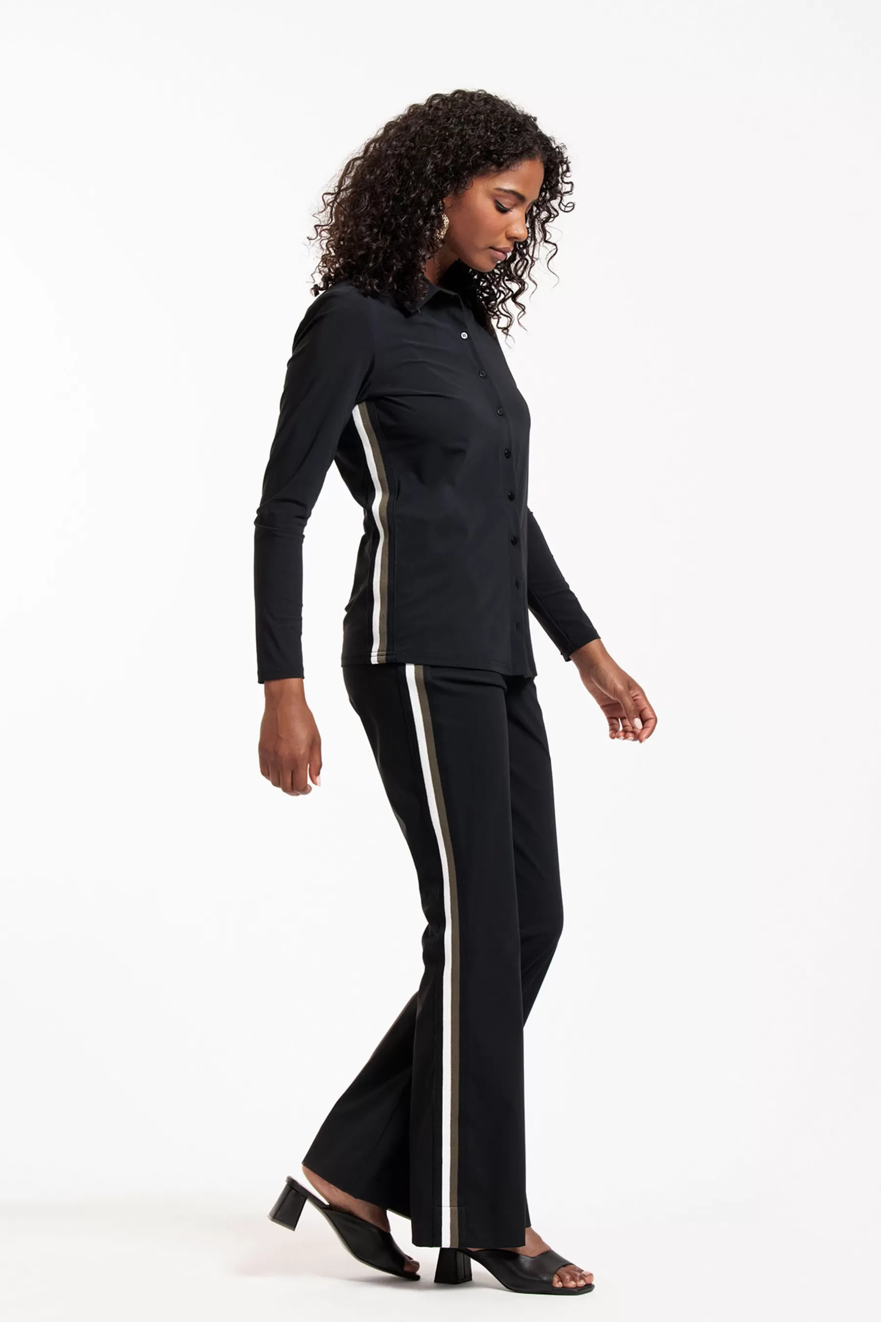 De Noa flair tape trousers van Studio Anneloes biedt de perfecte combinatie van stijl en comfort. De heavy travelstof is stevig en toch flexibel, waardoor je moeiteloos de hele dag door kunt bewegen. Deze stof kreukt niet, droogt snel en blijft mooi in vorm, zelfs na meerdere keren dragen. De wijde pijpen en de brede zoom geven een modieuze flair aan je outfit, terwijl het tape-detail langs de zijkant een speels en sportief accent toevoegt.