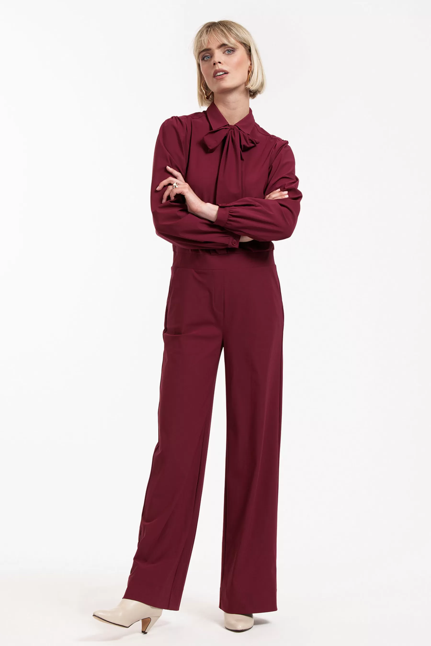 De Rowa jumpsuit van Studio Anneloes combineert klassieke elegantie met modern comfort. Uitgevoerd in de diepe kleur Merlot, straalt deze jumpsuit zowel luxe als stijl uit. De bovenkant is vervaardigd uit Medium Travelstof, terwijl de broek bestaat uit Heavy Travelstof, wat zorgt voor een unieke balans tussen comfort en stevigheid. De losse strik en bloezende mouwen geven de jumpsuit een verfijnde, vrouwelijke uitstraling. Perfect voor een zakelijke setting, maar ook voor een chic avondje uit.