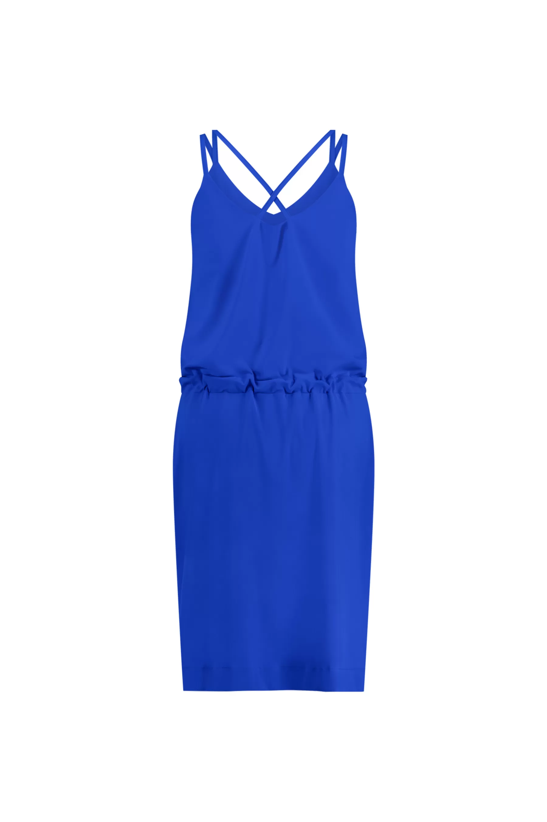 Deze cobaltblauwe jurk straalt frisse elegantie uit. De regular fit biedt een ontspannen maar verfijnde pasvorm, perfect voor elke gelegenheid tijdens je vakantie. De gekruisde bandjes op de schouders geven een speelse en stijlvolle touch, terwijl de steekzakken praktische elegantie toevoegen.