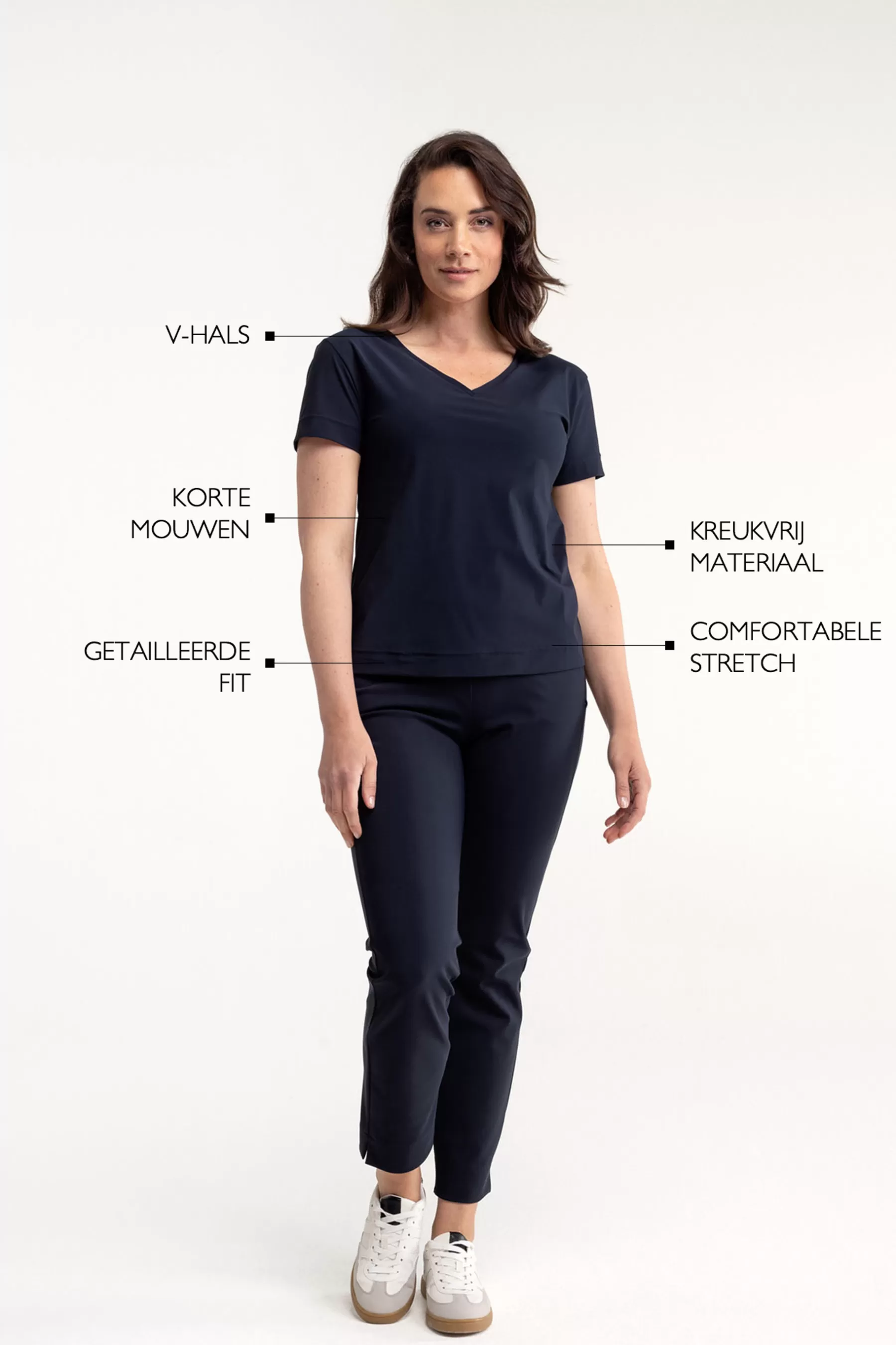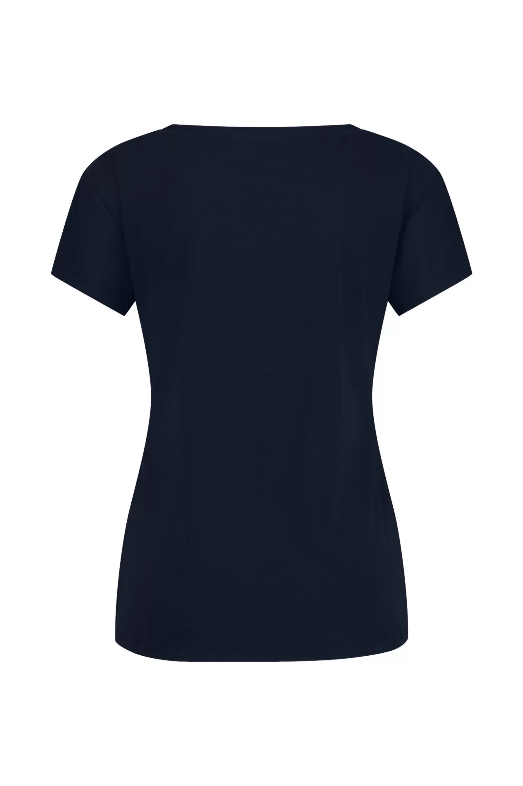 Deze donkerblauwe top biedt de perfecte balans tussen elegantie en draaggemak. De regular fit en getailleerde pasvorm zorgen ervoor dat het shirt mooi aansluit zonder in te boeten aan comfort. De V-hals en korte mouwen geven het een klassieke uitstraling, geschikt voor zowel zakelijke als casual gelegenheden.