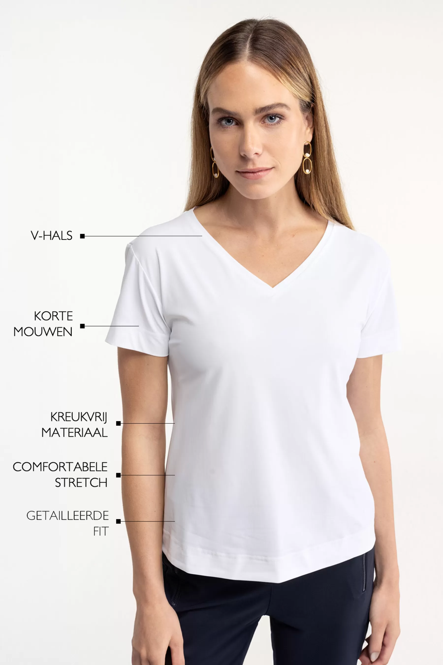Dit uni witte shirt combineert functionaliteit en stijl op een eenvoudige maar effectieve manier. De Medium Travelstof zorgt ervoor dat het shirt de hele dag goed blijft zitten zonder te kreuken, wat ideaal is voor drukke dagen. De V-hals zorgt voor een flatterend decolleté, terwijl de korte mouwen en getailleerde pasvorm een gestroomlijnd silhouet creëren.